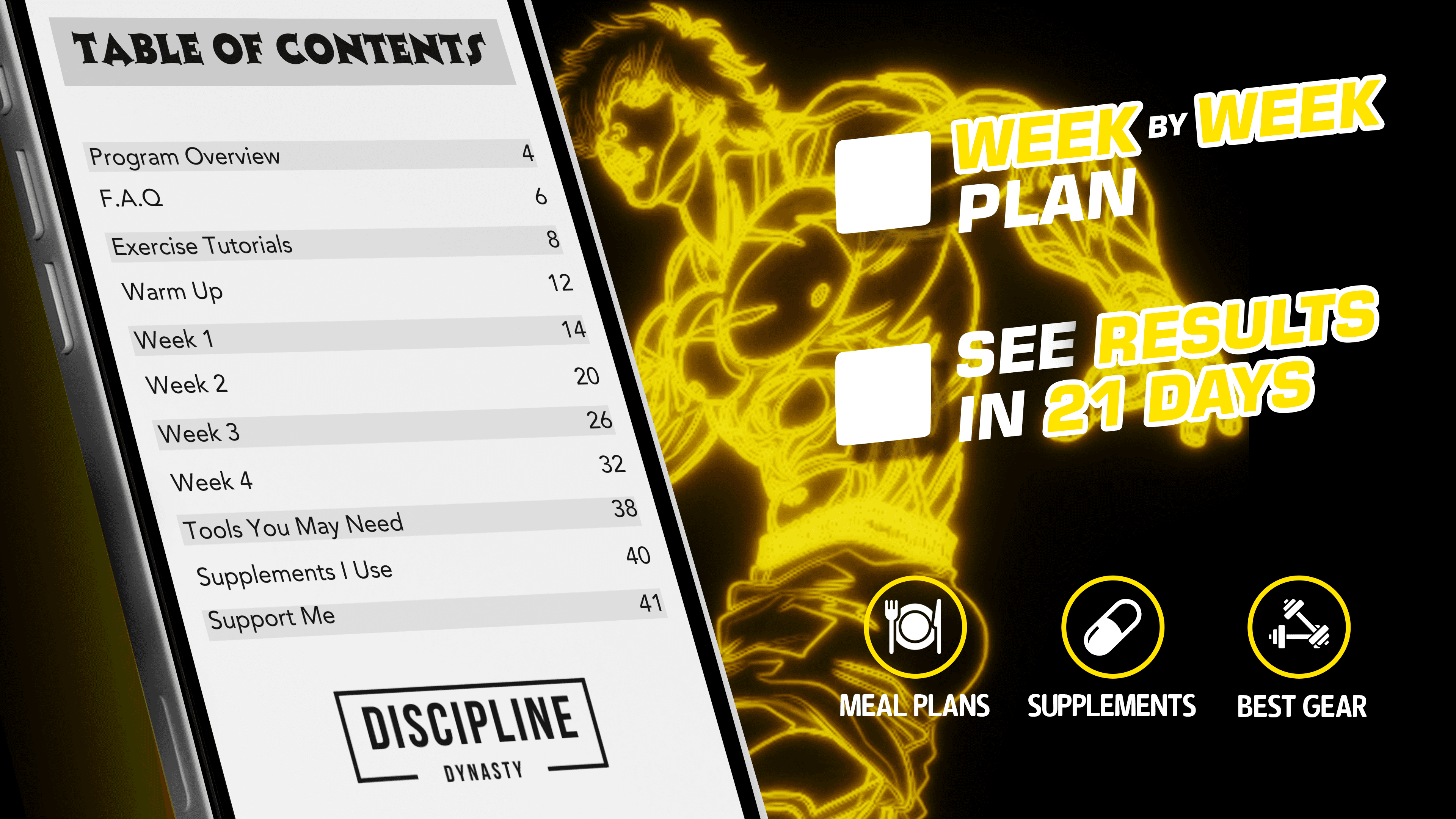 A complete 4-week transformation system built to replicate Baki Hanma’s dense muscle, brutal conditioning, and battle-hardened frame.
