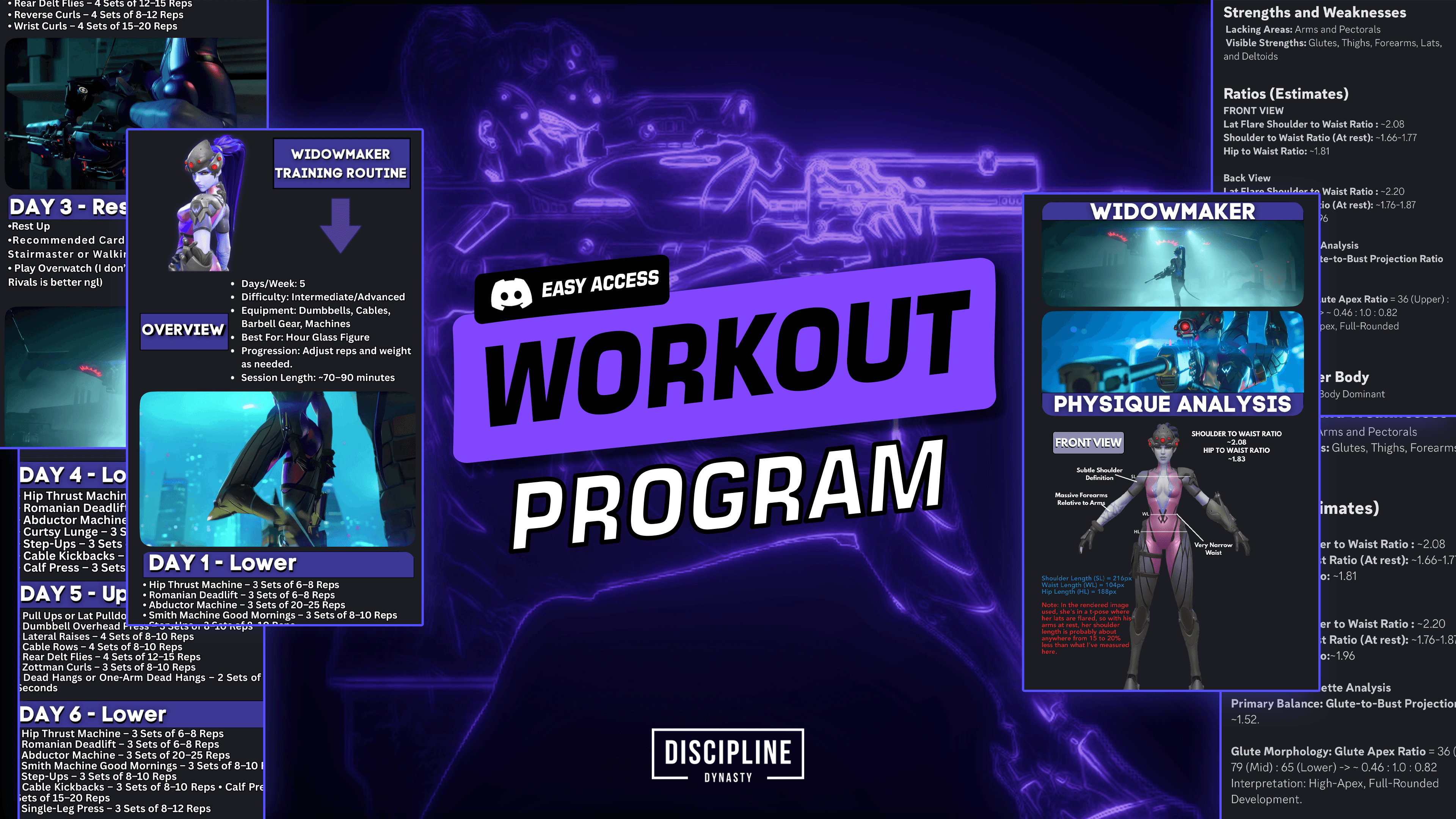 A step-by-step training system built to sculpt Widowmaker’s sleek, lethal, high-control physique.